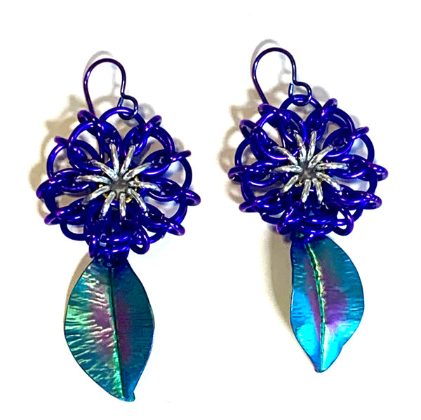 Celebrate summer with purple Celtic Flower earrings, featuring purple AA chainmaille woven into beautiful flowers. The anodized fold-formed leaves add a colorful, nature-inspired detail that brings charm and uniqueness to your look. This piece is perfect for adding a splash of color and joy to your outfit.