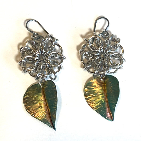 Celebrate summer with silver Celtic Flower earrings, featuring bright silver AA chainmaille woven into beautiful flowers. The anodized fold-formed leaves add a colorful, nature-inspired detail that brings charm and uniqueness to your look. This piece is perfect for adding a splash of color and joy to your outfit.