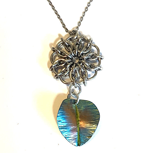 Celebrate summer with a silver Celtic Flower pendant, featuring bright silver AA chainmaille woven into a beautiful flower. The anodized fold-formed leaf adds a colorful, nature-inspired detail that brings charm and uniqueness to your look. This piece is perfect for adding a splash of color and joy to your outfit.